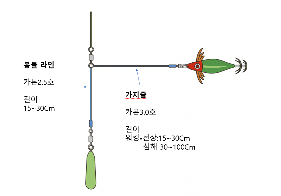 • 수심이 깊은 곳에서는 무게추+에기 조합이 유리합니다.