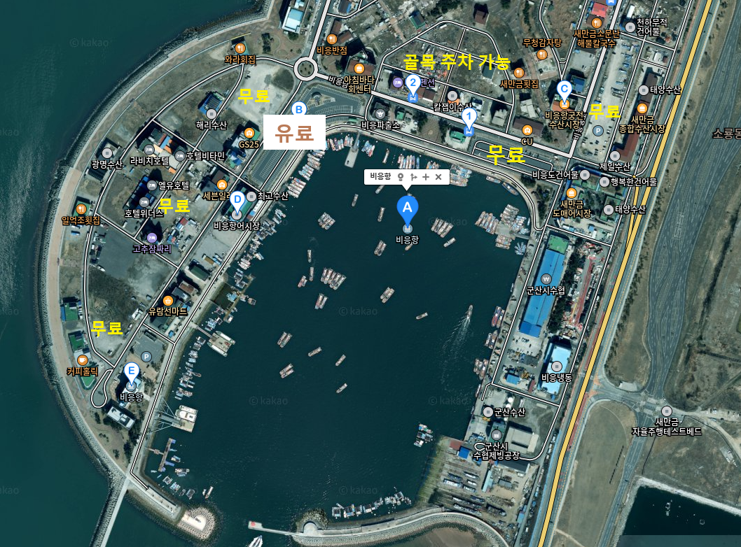 비응항 바로 근처에 가까운 유료 주차장이 있지만, 알아두면 유용한 무료 주차 구역도 곳곳에 존재합니다. 아래는 현지 기준으로 파악한 2025년 무료 주차 가능 장소입니다.