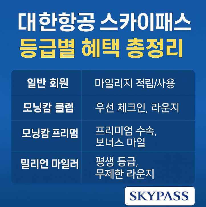대한항공 스카이패스는 등급별로 혜택이 상당히 다르며, 장거리나 자주 이용하는 고객일수록 승급 시 유리합니다.