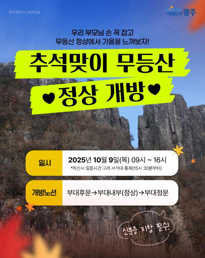 2025년 10월 9일(목), 추석 연휴를 맞아 무등산 정상이 단 하루 전면 개방됩니다.