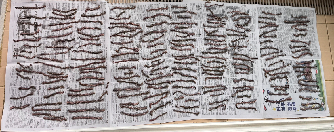 지렁이를 일자로 펴서 통풍이 잘 되는 그늘이나 햇볕에 4~24시간 정도 말립니다.