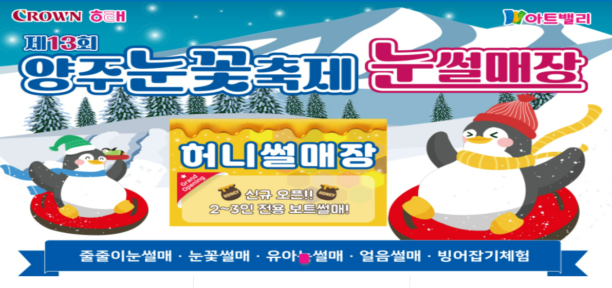 눈썰매부터 가족 체험까지 모두 만족할 수 있는 양주눈꽃축제! 이번 겨울에는 따뜻한 옷과 설렘을 가득 안고 양주로 떠나보세요. 겨울의 낭만과 추억이 가득한 시간이 기다리고 있습니다.