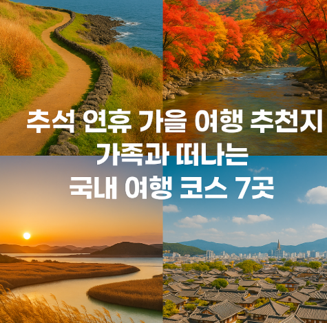 추석 연휴는 가족과 함께, 혹은 혼자 여유로운 시간을 보내기 딱 좋은 시기입니다. 올해는 연차를 활용하면 긴 황금연휴가 가능하니, 가까운 국내 여행으로 가을 정취를 만끽해보세요. 아래에서 추천하는 7곳은 자연·문화·힐링을 한 번에 즐길 수 있는 곳들입니다.
