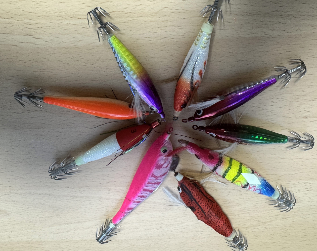 에기는 쭈꾸미나 갑오징어를 유혹하는 인조 미끼입니다. 보통 야광, 컬러, 깃털 등 다양한 옵션이 있고, 색상에 따라 대상어의 반응이 달라지는 게 특징이에요.