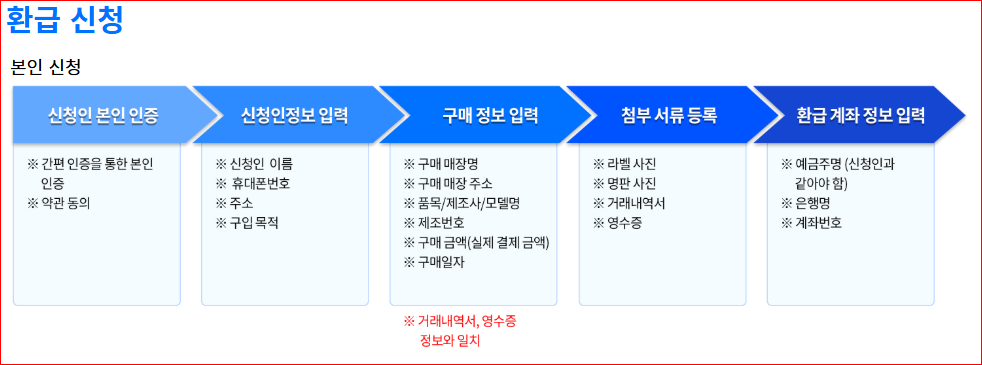 - 구매자 명의와 신청자 명의가 동일해야 하며, 환급 계좌의 예금주도 동일인이어야 함.